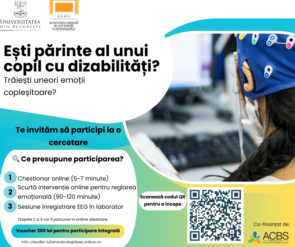 Te invităm să faci parte dintr-o cercetare inovatoare Facultatea de Psihologie și Științele Educației din cadrul Universității din București, în colaborare cu Laboratorul CINETic al Universității Naționale de Artă Teatrală și Cinematografică, derulează o cercetare dedicată părinților copiilor cu dizabilități de dezvoltare. De ce acest studiu? Alte studii arată că părinții copiilor cu dizabilități de